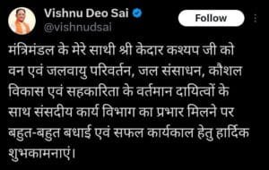 आपको बता दे कि पहले ये विभाग बृजमोहन अग्रवाल के पास था, जो उनके इस्तीफे के बाद मुख्यमंत्री के पास चला गया था।