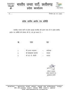बीजेपी ने प्रदेश स्तरीय आरोप पत्र समिति की घोषणा कर दी है। बीजेपी प्रदेश अध्यक्ष अरुण साव ने इसकी सूची जारी कर दी है, जिसमें प्रदेश प्रवक्ता अजय चंद्राकर को संयोजक की जिम्मेदारी है। वहीं पूर्व मंत्री प्रेम प्रकाश पांडेय और महामंत्री ओपी चौधरी समिति के सदस्य बनाए गए हैं।