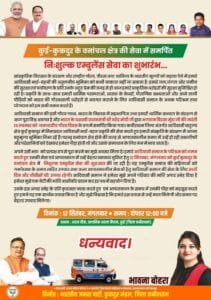 वही, आपातकालीन स्थिति में आदिवासी लोगों को हो रही परेशानियों को देखते हुए भाजपा द्वारा 24 घंटे एंबुलेंस की मुफ्त सेवा दी जाएगी। प्रदेश मंत्री BJP महिला मोर्चा और सभापति जिला पंचायत भावना बोहरा के नेतृत्व में आज 12 सितंबर दोप 12:00 बजे अटल चौक प्राथमिक शाला मैदान में नि:शुल्क एंबुलेंस सेवा प्रारंभ की जाएगी।