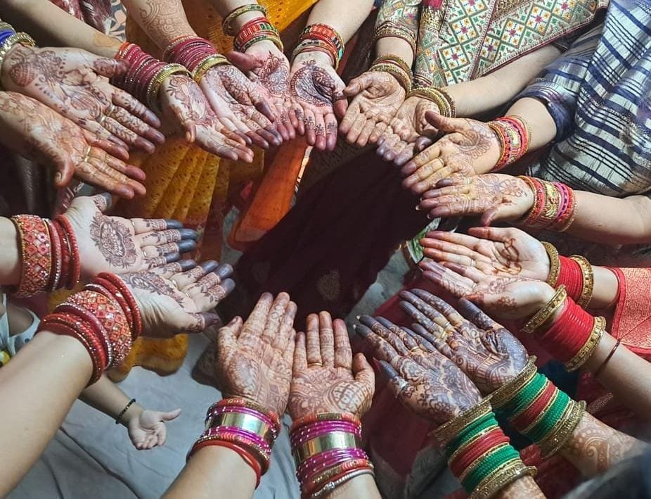 सुहागिनो ने हाथों में मेहंदी लगाकर माता पार्वती शंकर भगवान की पूजा अर्चना