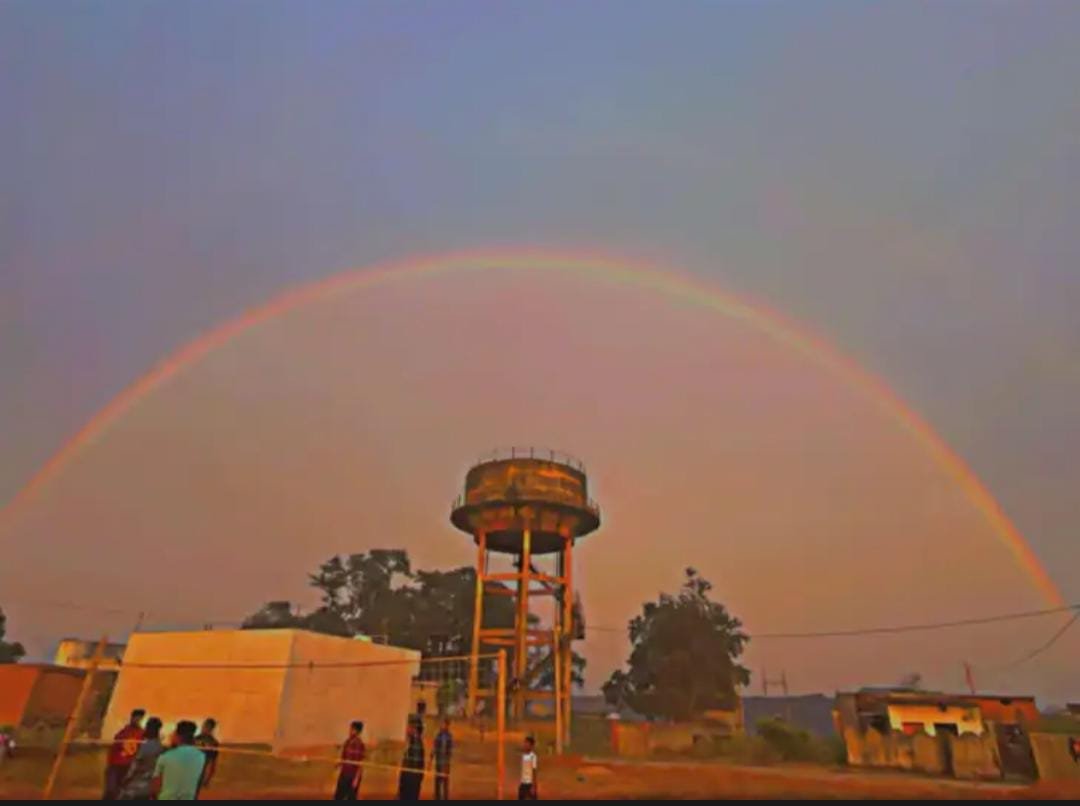 आसमान में सतरंगी इंद्रधनुष अपनी अर्धचंद्राकार आकृति में दिख रहा था। बहुत लम्बे समय बाद इंद्रधनुष को लोगों ने बनते देखा ।