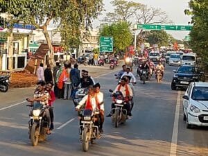Kabirdham big news: Vijay Sharma reached Kawardha for the first time after becoming Deputy CM, grand welcome with grand bike rally.