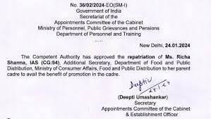 कैबिनेट की अपॉइंटमेंट कमेटी ने 24 जनवरी को ऋचा शर्मा को छत्तीसगढ़ कैडर में वापसी को मंजूरी दे दी है। ऋचा शर्मा छत्तीसगढ़ में एसीएस स्तर की अधिकारी होंगी।