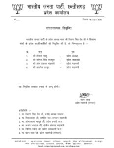 छत्तीसगढ़ बड़ी खबर : प्रदेश महामंत्रियों को कई जिम्मेदारियां, भाजपा किसान मोर्चा और अन्य पिछड़ा वर्ग मोर्चा के पदाधिकारियों की नियुक्ति
