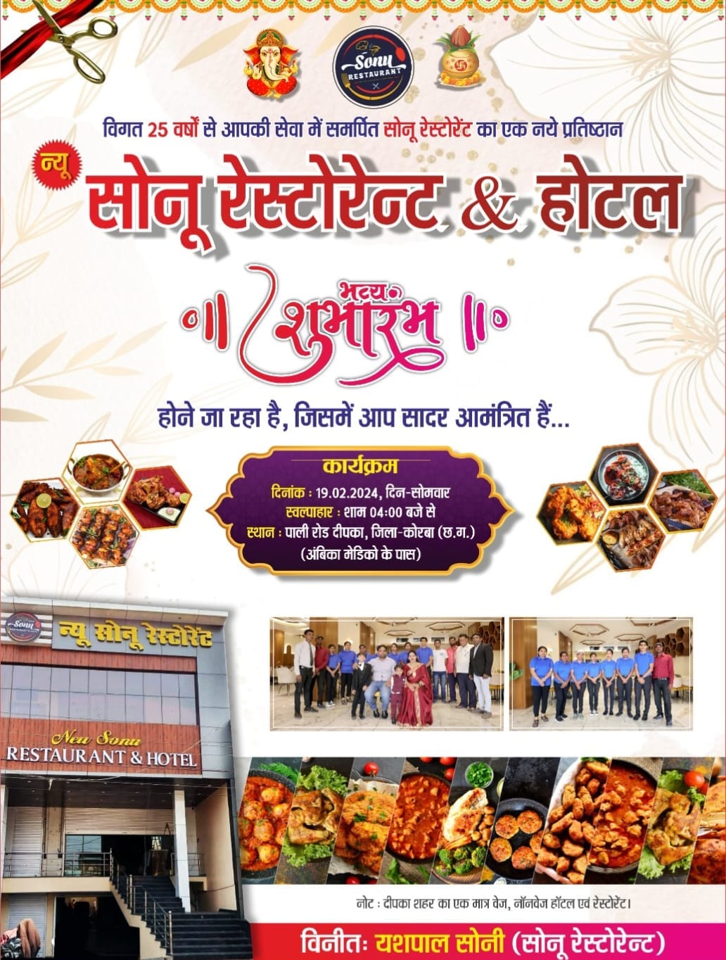 अपनी मनपसंद और जायकेदार लजीज व्यंजनों के लिए अब आपको दीपका शहर से दूर जाने की जरूरत नहीं होगी, जी हां हम बात कर रहे बजरंग चौक दीपका स्थित न्यू सोनू रेस्टोरेंट & हॉटल का जिसका 19 फरवरी सोमवार को होगा भव्य शुभारंभ ।