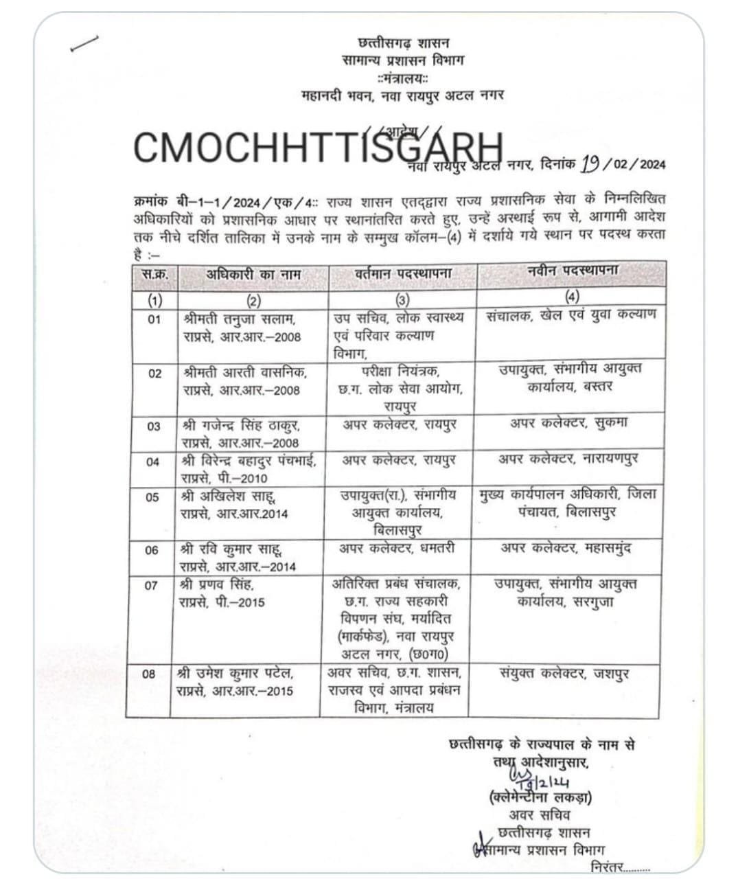 रायपुर। राज्य शासन द्वारा राज्य प्रशासनिक सेवा के अधिकारियों के नवीन पदस्थापना आदेश जारी