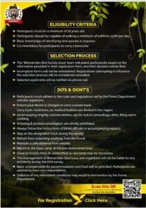 भाग लेने के लिए व्यक्ति को 15 मई 2024 के पूर्व पंजीयन करवाना होगा। पंजीयन ऑनलाइन किया जाना है, पंजीयन हेतु क्यूआर कोड को स्कैन कर लिंक खोलें और पंजीयन करें। पंजीयन अवधि पूर्ण होने उपरांत भोरमदेव बर्ड सर्व समिति के द्वारा सर्वे में भाग लेने हेतु प्रतिभागियों का चयन किया जाएगा। चयनित प्रतिभागियों को भाग लेने हेतु पृथक से सूचना दी जाएगी एवं चयनित प्रतिभागियों को निर्धारित शुल्क 1000 रुपए जमा करना होगा।