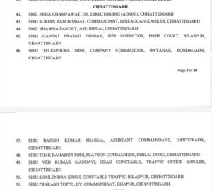 डीआईजी नेहा चंपावत, कमांडेंट सर्जन राम भगत, एएसपी भावना पांडे, सब इंस्पेक्टर गणपत प्रसाद पांडे, कंपनी कमांडर तेलेश्पर मिंज, असिस्टेंट कमांडेंट राजेश कुमार शर्मा, प्लाटून कमांडर ठकबहादुर सोनी, हेड कांस्टेबल वेद कुमार मंडावी, कांस्टेबल शैलेंद्र सिंह, कमांडेंट प्रकाश टोप्पो.