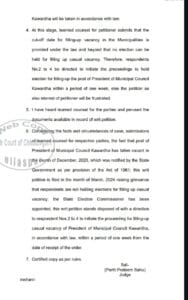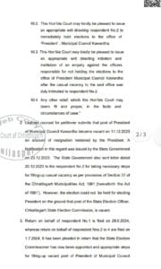 जिसमे माननीय न्यायालय ने कहा है कि नगर पालिका परिषद के अध्यक्ष पद पर चुनाव छत्तीसगढ़ नगर पालिका अधिनियम 1961 कीधारा 37 के अंतर्गत निर्धारित नियमों के अनुसार नहीं हो रहा था। माननीय न्यायालय ने यह निर्णय लेने के पश्चात कहा कि चुनावतत्काल कराया जाए और सभी तथ्यों के आधार पर निर्वाचन आयोग को निर्देश दिया कि वह 7 दिनों के भीतर आवश्यक अधिसूचना जारी करके प्रक्रिया आरंभ करे। सभी अधोहस्ताक्षरी पार्षदगण द्वारा विनम्र अनुरोध है कि चुनाव तत्काल कराया जाए, संविधान की भावना की रक्षा की जाए तथा कानून का शासन सुरक्षित रहे।