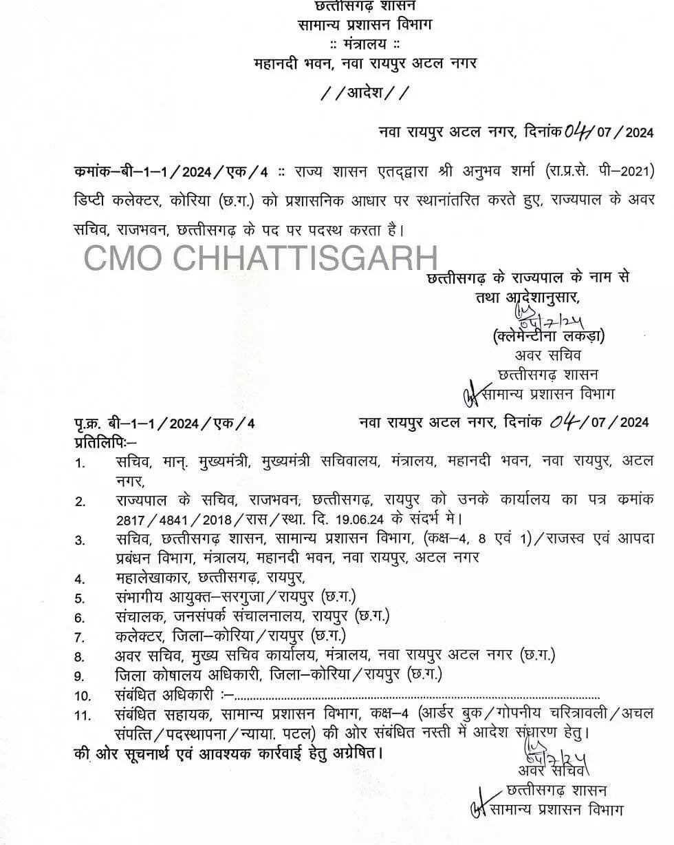 रायपुर। राज्य शासन द्वारा प्रशासनिक सेवा के अधिकारी अनुभव शर्मा को राज्यपाल के अवर सचिव के पद पर पदस्थ किया गया।