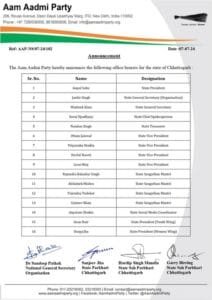 रायपुर। आम आदमी पार्टी ने छत्तीसगढ़ प्रदेश कार्यकारिणी की घोषणा की। गोपाल साहू को प्रदेश अध्यक्ष नियुक्त किया गया है। इसके अलावा अन्य पदों पर भी नियुक्ति की गई है. लोकसभा चुनाव में मिली हार के बाद पार्टी का यह पहला बड़ा कदम है।