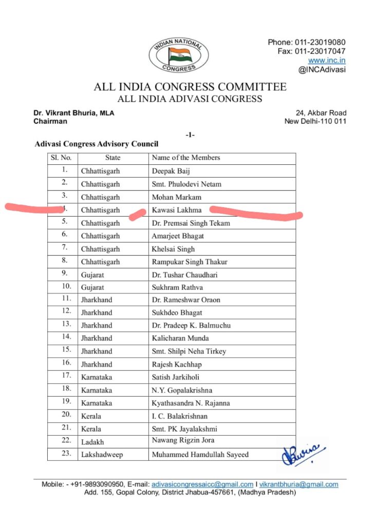 कांग्रेस ने जारी की ST सलाहकार परिषद की सूची, कवासी लखमा समेत 8 नेताओं को दी अहम जिम्मेदारी