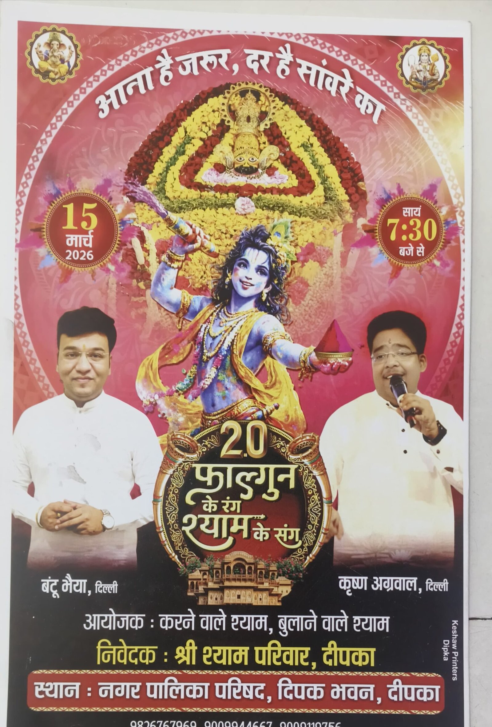 “फाल्गुन के रंग श्याम के संग” भजन संध्या 15 मार्च को, दिल्ली के प्रसिद्ध गायक बंटू भैया व कृष्ण अग्रवाल देंगे प्रस्तुति